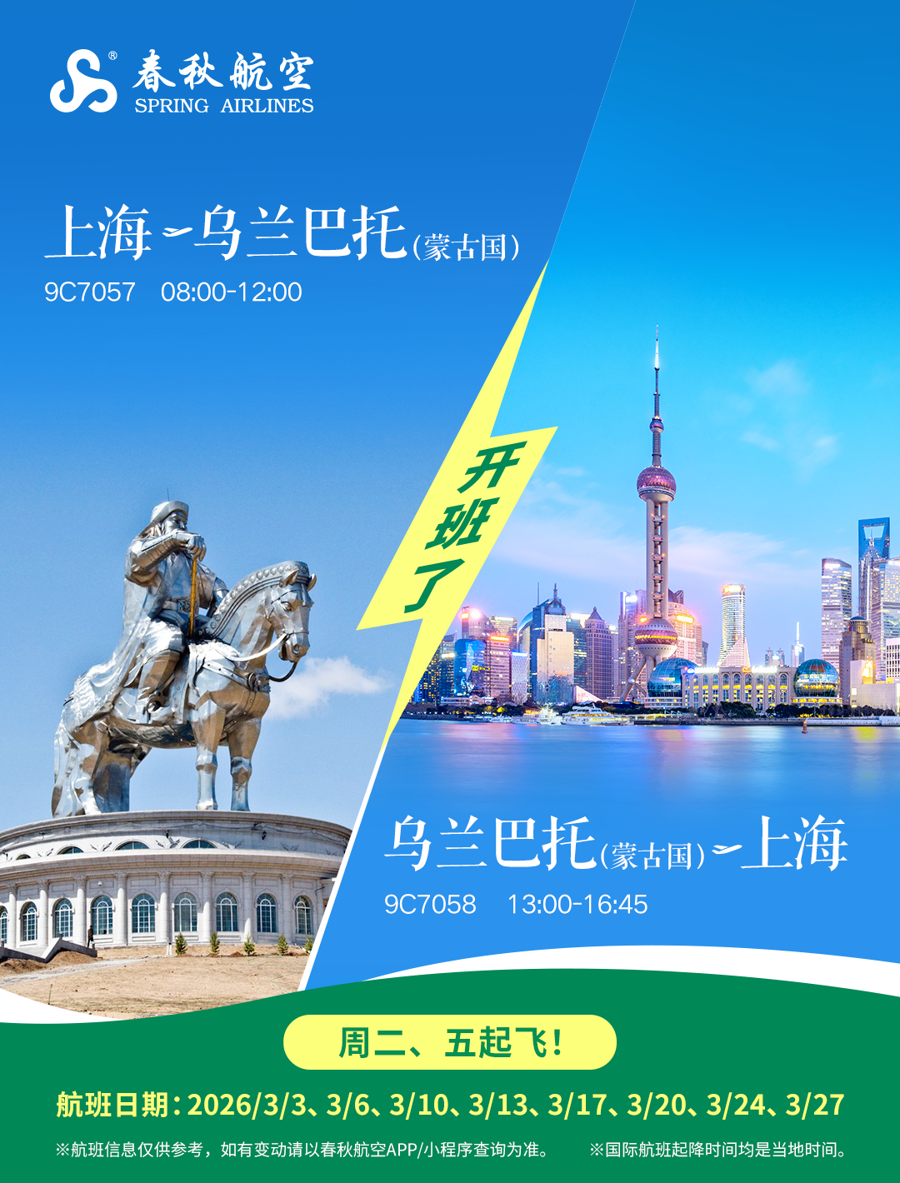 春秋航空今日宣布,将于2026年3月3日正式开通上海浦东至蒙古国首都乌兰巴托的独家直飞往返航线。上海空中网络“朋友圈”不断扩大,也是春秋航空积极参与上海“全方位门户复合型国际航空枢纽”建设、持续拓展“一带一路”航线网络的最新实践。